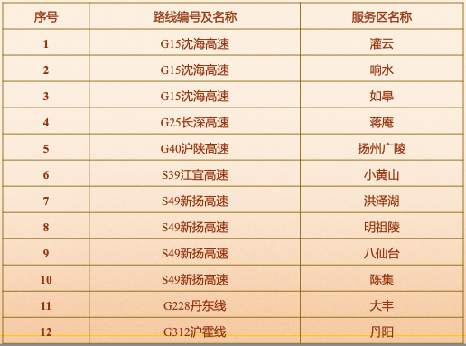 13条高速公路诀别为京沪高速广靖锡澄段、江阴大桥、京沪沪宁高速无锡苏州共线段、苏通大桥、沪武高速张家港至省界段、常台高速苏州南段、长深高速淮安段、新扬高速扬州西北绕城段、宁洛高速江苏段、八卦洲大桥、润扬大桥、长深高速溧阳至宜兴段。4条庸碌国省说念路段诀别为G204连云港赣榆城区段、G524苏州莫城段、G345扬州段、G346无锡段。